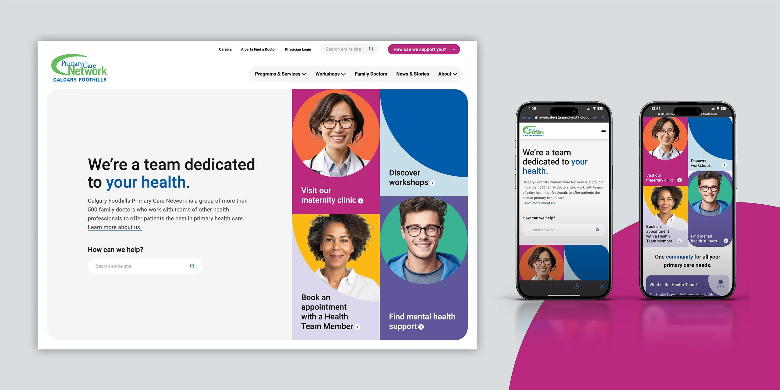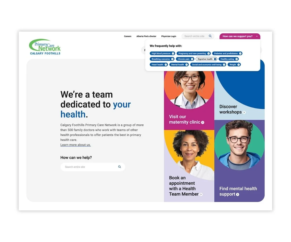Comprising more than 500 family physicians and healthcare professionals, Calgary Foothills Primary Care Network (CFPCN) is committed to delivering exceptional primary care. Recognizing the need for their digital presence to reflect that same level of support and accessibility, CFPCN partnered with Strut to reimagine the online experience for individuals seeking healthcare providers and resources. As Creative Director and Lead Designer, my goal was to infuse the platform with clarity and vibrancy—transforming a typically clinical experience into one that is engaging, intuitive, and fully accessible to all users.